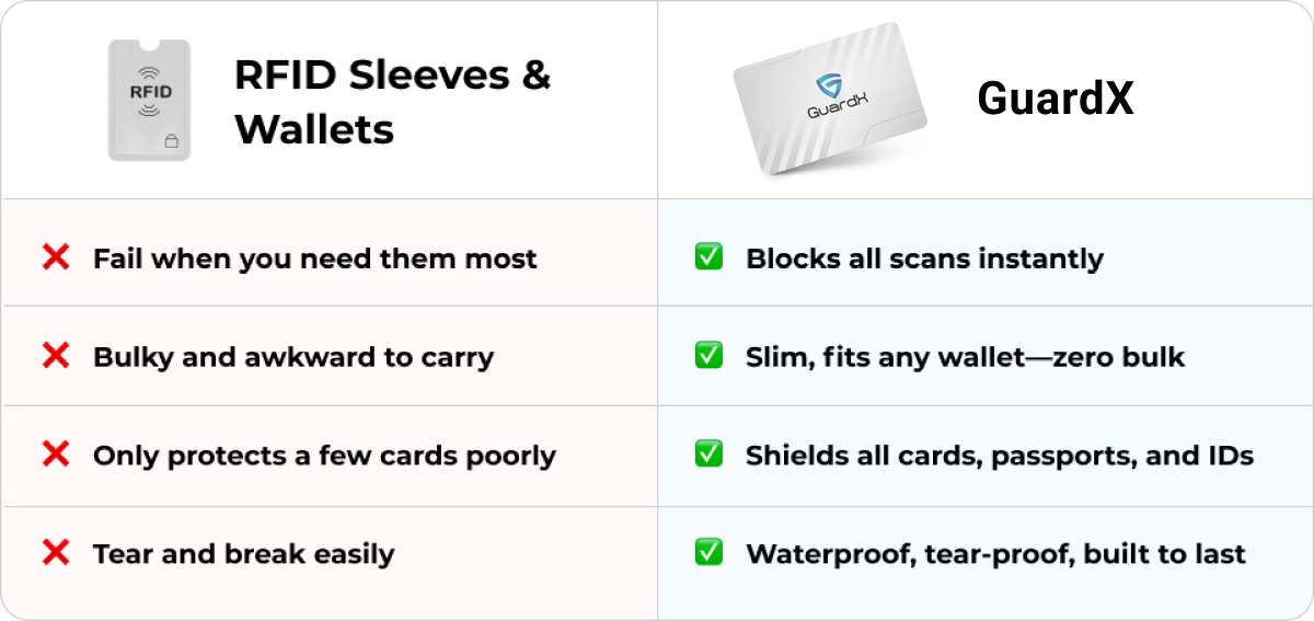 Most RFID blockers wear out, rip, or stop working. GuardX is tear-proof, waterproof, and engineered for life. Buy once, stay protected forever.
